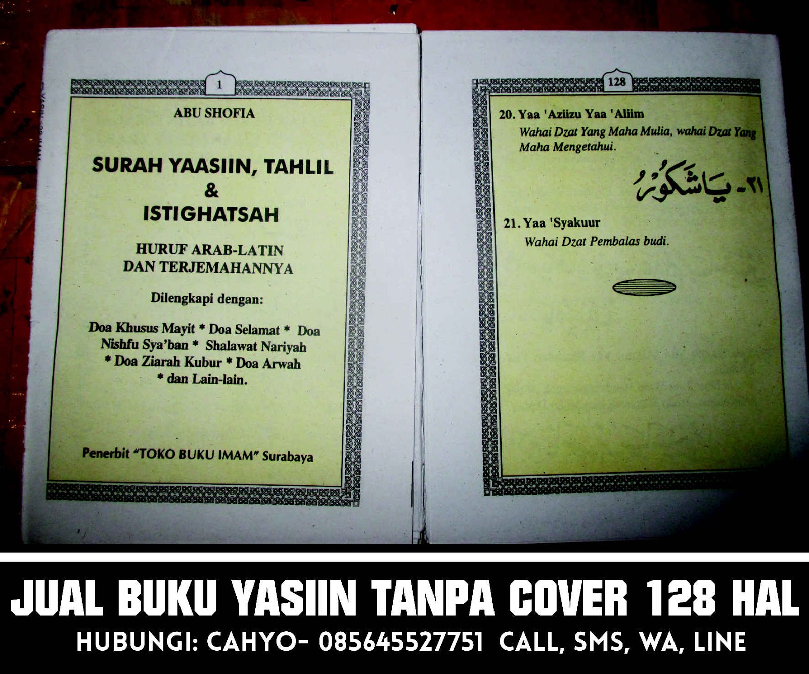 Disini kami melayani penjualan buku yasin tanpa cover untuk 128 halaman, yang mana buku yasin ini juga terdapat Tahlil, Istighatsah dan huruf buku yasin ini menggunakan huruf ARAB-LATIN dan TERJEMAHANNYA. Dilengkapi dengan: Doa Khusus Mayit, Doa Selamat, Doa Nisfhu Sya’ban, Shalawat Nariyah, Doa Ziarah Kubur. Yang mana ukuran buku ini sendiri adalah 12,5 x 15,5 CM. dengan warna dasar kuning dan bingkai warna hitam.