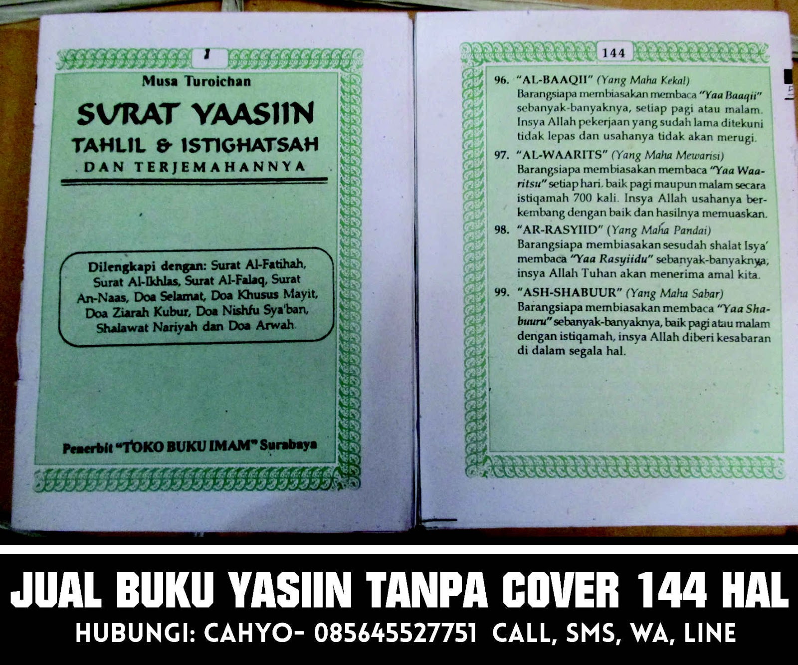 Disini kami melayani penjualan buku yasin tanpa cover untuk 144 halaman, yang mana buku yasin ini juga terdapat Tahlil, Istighatsah dan huruf  buku yasin ini menggunakan huruf ARAB-LATIN dan TERJEMAHANNYA. Dilengkapi dengan: Surat Al-Fatihah, Surat Al-Ikhlas, Surat Al-Falaq, Surat An-Naas, Doa Khusus Mayit, Doa Selamat, Doa Nisfhu Sya’ban, Shalawat Nariyah, Doa Ziarah Kubur, Doa Arwah. Yang mana ukuran buku ini sendiri adalah 12,5 x 15,5 CM. dengan warna dasar dan bingkai warna hijau.
